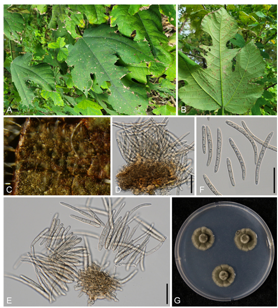 Fig. 1. Leaf spot disease caused by Pseudocercospora broussonetiae on Broussonetia papyrifera. A: Symptoms of infected plants in the field; B: Leaf spots on the lower surface; C: Fructification of the fungus on the lesion, showing a grayish to brown mass of conidia; D: Conidiophores on a stroma; E: Conidiogenous cells and mass of conidia; F: Conidia; G: Three-week-old colonies of Ps. broussonetiae on potato dextrose agar at 25°C. Scale bar indicates 20 µm.