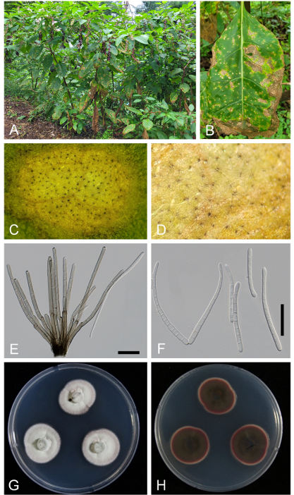 Fig. 1. Cercospora flagellaris s. str. on Phytolacca americana (micrographs were obtained from the sample JBNU-F0463). A: Infected plants showing leaf spots in the field; B: Young and mature leaf spots coalescing into necrotic lesions on the affected leaf; C: Close-up view of the leaf spot; D: Close-up view of fructification under a stereo microscope; E: Conidiophore; F: Conidia; G: One-week-old colonies grown on potato dextrose agar (PDA) at 25°C (obverse surface); H: Reverse surface of the same colony. Scale bars = 30 µm.
