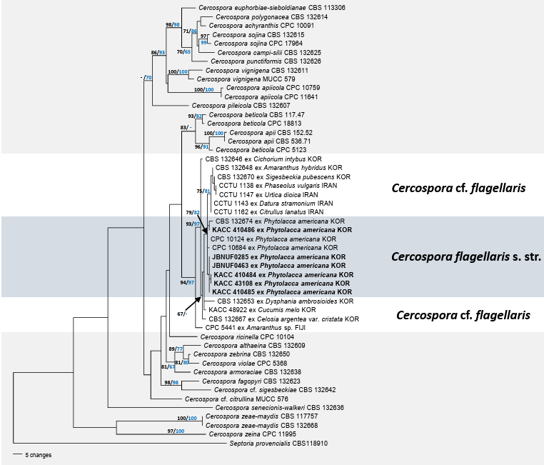 Cercospora cf. flagellaris is one of the unresolved species complexes within the genus Cercospora. Despite recent advances in molecular approaches for species delimitation using multigene sequence analysis, the identity of C. flagellaris remains unclear. As new records are accumulated, the complexity of this species group increases, encompassing hosts from a wide range of plant families. Phytolacca americana, a species native to North America and later introduced to East Asia, was the original host of this fungus. Since 1991, leaf spot diseases caused by C. flagellaris have been consistently reported in Korea. In this study, we summarized all isolates identified as C. flagellaris from P. americana in Korea to date, to infer their morphological and molecular phylogenetic identities and to understand the true identity of this fungus. All isolates were morphologically and molecularly examined, illustrated, and their phylogenetic placement was demonstrated in a tree inferred from multigene sequence analyses.