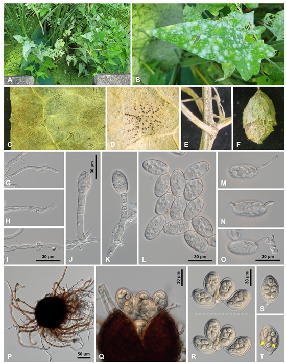 Fig. 1. Erysiphe actinostemmatis, a powdery mildew found on Actinostemma lobatum. A: Powdery mildew symptoms on A. lobatum. B: Close-up view of an infected leaf. C: Chasmothecia formed on the infected leaf. D: Close-up view of the chasmothecia. E: Chasmothecia formed on the stems. F: Chasmothecia formed on the fruit. G–I: Appressoria on the hypha. J–K: Conidiophores. L: Conidia. M–O: Conidia in germination. P: Chasmothecium with appendages. Q: Chasmothecium protruding asci. R: Cluster of asci focused at different depths, showing 6–7 ascospores per ascus. S: Ascus with six ascospores. T: Ascus with eight ascospores. Two ascospores indicated by arrows are out of focus.