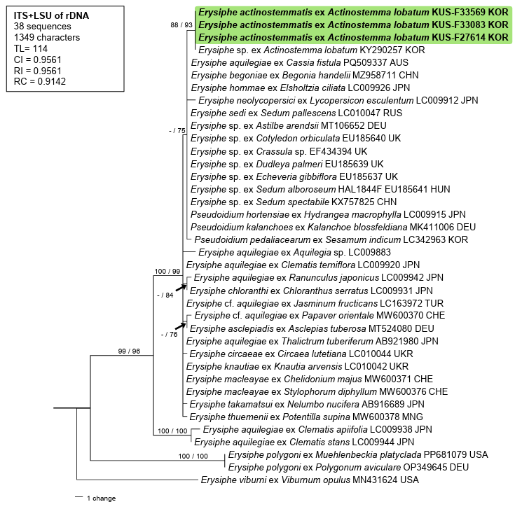Fig. 2. Parsimonious tree constructed to reveal the phylogeny of Erysiphe actinostemmatis based on a combined dataset of the internal transcribed spacer (ITS) region and the large subunit (LSU) gene of rDNA sequences. The isolates obtained in this study are shown in bold. Bootstrap values (≥70%) obtained from the maximum parsimony and maximum likelihood analyses are indicated on relevant branches, respectively. The calculated tree scores, such as tree length (TL), consistency index (CI), retention index (RI), and rescaled consistency index (RC), are shown in the box.
