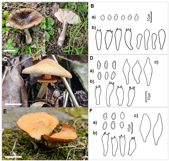 Fig. 1. Fruiting bodies and microscopic features of Amanita yanshanensis (A, B), Cyclocybe erebioides (C, D) and Mallocybe aurantiodisca (E, F). a, basidiospores; b, basidia & basidiol; c, Pleurocystidia. The scale bar is 10 μm in the microscopic images.