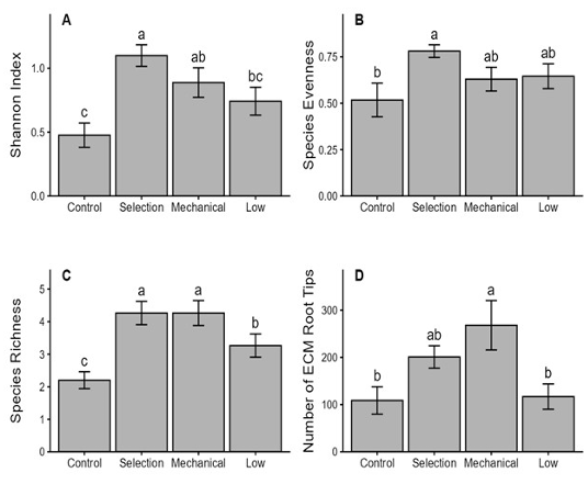 When thinning methods were compared under moderate-intensity thinning (Fig. 3), selection thinning resulted in the highest species diversity and evenness, whereas mechanical thinning produced the greatest number of ECM root tips. These results indicate that selection thinning favors a more balanced ECM fungal community, whereas mechanical thinning promotes root-tip proliferation, likely reflecting differences in soil disturbance and resource availability. Both thinning methods differed significantly from the control in several metrics (e.g., richness and tip abundance), suggesting that stand structural changes associated with thinning can modulate ECM assemblages beyond the effect of intensity alone. Because the thinning methods were sampled at a single intensity, these contrasts should be interpreted with caution.