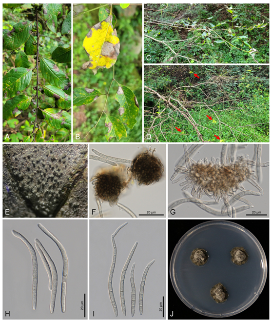Observed morphological characteristics of the fungus include the following: Leaf spots were amphigenous, irregular to angular, 5–15 mm in diameter (or larger by coalescing discrete lesions), with greyish lesion with dark brown margin (Fig. 1A–D). Caespituli were amphigenous, albeit primarily hypophyllous, fasciculate to solitary (Fig. 1E). Mycelium was internal and external, with septate and branched hyphae. Stroma were well-developed, sub-globular, erumpent, light to dark brown, up to 30–60 µm in diameter (Fig. 1F). Conidiophores were numerous, in dense fascicles, smooth-walled, 2–4-septate, cylindrical to sub-cylindrical, straight, 14–37(–40) × (2.5–)3–5 µm. Conidiogenous cells were monoblastic, hyaline, unbranched, 3–6 µm, with inconspicuous scars (Fig. 1G). Conidia were solitary, narrowly obclavate to cylindrical, smooth, hyaline, straight to slightly curved, 6–11-septate, apex obtuse, base truncate, 25–85(–92) × (2.9–)3.3–5.4 µm, with an unthickened and not darkened hila (Fig. 1H–I). Fourweek-old fungal colonies grown on PDA at 25°C were slow-growing, 10 mm in diameter, olivaceous to greyish towards the center, with an erose or dentate margin, developed moderate aerial mycelium, and dark olivaceous to black on the reverse surface (Fig. 1J).