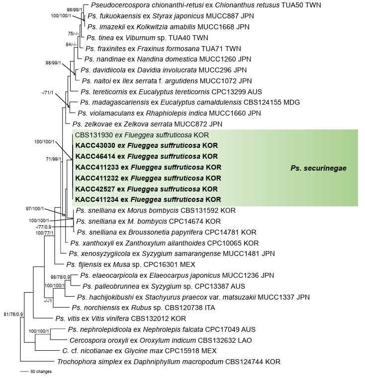 Due to the absence of a detailed description of Ps. securinegae in previous studies, the morphological characteristics of the Korean isolates were compared with an original description of C. securinegae [1], from which the species was transferred. The Korean isolates correspond well with the original description of C. securinegae in stromata size (35–60 µm vs. 35–50 µm), conidiophore morphology and dimensions (1437(–40) × (2.5–)3–5 µm vs. 25–40 × 3–4 µm), and conidial shape and size (25–85(–92) × (2.9–)3.3–5.4 µm vs. 25–125 × 3–4 µm). Although our specimens exhibited slightly larger stromata and more septate conidia, these differences correspond to the expected intraspecific variation of Pseudocercospora. In addition, among Flueggea hosts, Ps. aberrans has been reported on F. virosa from China [7] and was therefore considered in our comparative assessment. The species shows clear distinguishing features, including smaller stromata (15–35 µm), very long conidiophores (up to 205 µm), and pale olivaceous, 1–3-septate conidia. These distinct characteristics clearly separate Ps. aberrans from Korean isolates.