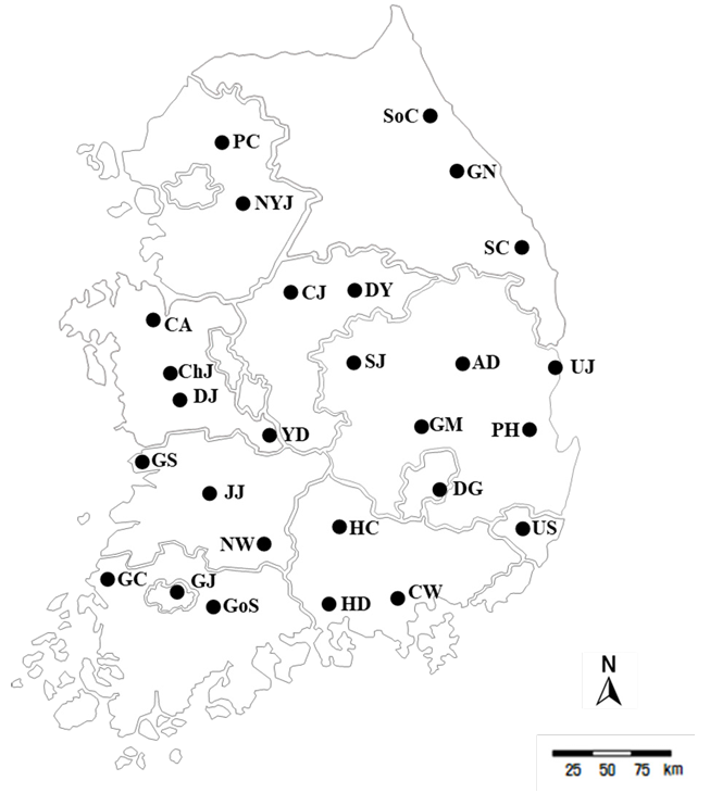 Fig. 1. Sampling locations of rose (Rosa spp.) leaf samples showing black spot symptoms in Korea. Abbreviations beside the circles correspond to those listed in Table 1.