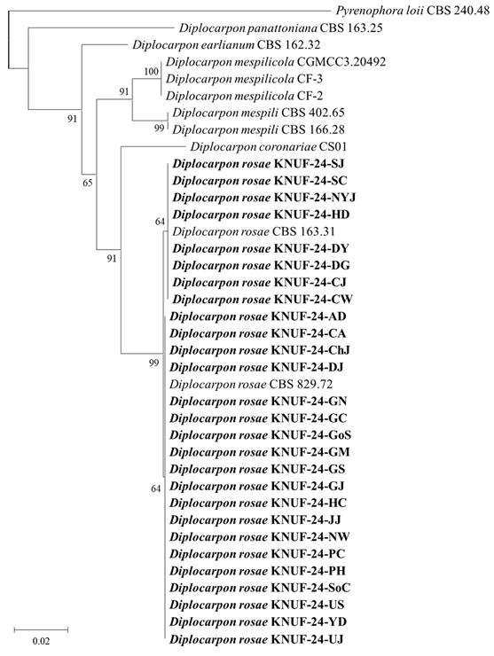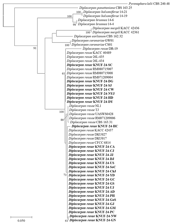 Fig. 3. Maximum likelihood phylogenetic tree based on ITS regions sequence showing the phylogenetic position of the isolated strains among the related strains in the genus Diplocarpon. Pyrenophora lolli CBS 240.48 was used as the outgroup. The strains isolated in this study are indicated in bold, and the numbers above the branches represent the bootstrap values (> 60%) obtained for 1,000 replicates. Scale bar = 0.050 substitutions per nucleotide position.