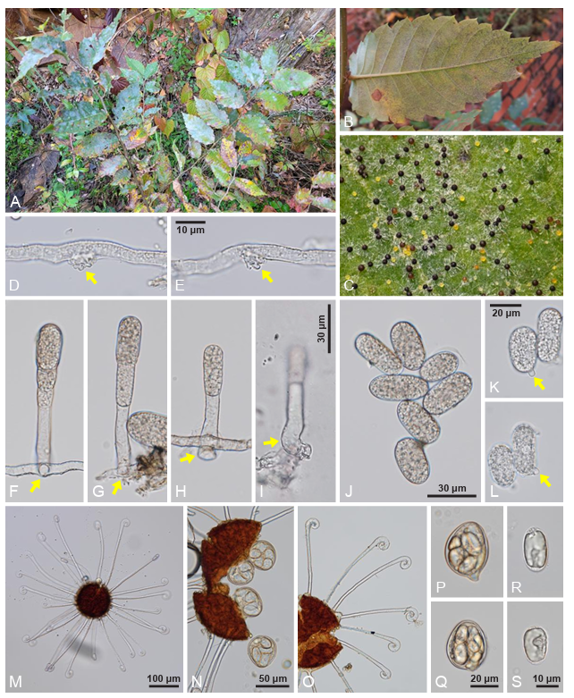 Fig. 1. Erysiphe zelkovae, a powdery mildew fungus found on Zelkova serrata (KUS-F34595). A: Powdery mildew symptoms on the leaves. B: Chasmothecia of E. zelkovae formed on the lower leaf surface. C: Close-up view of chasmothecia. Note yellowish, immature chasmothecia. D and E: Appressoria formed on the hyphae (arrows). F–I: Conidiophores. Note the lower part of conidiophores emerging from the side of creeping hyphae (arrows). J: Conidia. K and L: Conidia germinating (arrows). M: Chasmothecium with appendages. N: Asci protruding from the chasmothecium. O: Chasmothecial appendages with enlarged apex. P and Q: Mature asci. R and S: Ascospores.