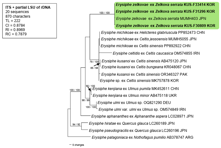 To confirm the morphology-based identification, genomic DNA was obtained from three herbarium samples (KUS-F30809, F31296, and F33414). The LSU gene and ITS region, including the 5.8S rDNA gene, were amplified and sequenced using the primer pairs PM3/NLP2 and ITS1/PM6, respectively [8]. Forward and reverse reads were combined in MEGA11 [9], and the resulting sequences were submitted to the National Center for Biotechnology Information database (accession numbers: PX916213–PX916215 for ITS, and PX916216–PX916218 for LSU). Sequence similarity searches were performed against the GenBank database using BLASTn search tool. The results showed 100% identity in the ITS region with the sequences of E. zelkovae (AB475121) and in the LSU region with E. zelkovae (AB475114). The sequences of the LSU region were found to be 98.3% similar to those of E. nothofagi (AB378736) and 97.4% to Erysiphe sp. (OQ221121). To determine the phylogenetic placement of E. zelkovae among other closely related uncinuloid powdery mildews, a concatenated dataset of ITS and LSU sequences was assembled using MEGA11 for 20 Erysiphe sequences, including 17 sequences retrieved from GenBank. Sequence of Erysiphe patagoniaca Havryl. & S. Takam. (AB378747) was used as an outgroup taxon. Maximum parsimony (MP) analysis was conducted in PAUP* 4.0.a using the heuristic searches with the “tree-bisection-reconstruction” algorithm and 100 random sequence additions. All characters were treated as unordered and unweighted, and gaps were interpreted as missing data [10]. Tree statistics, including tree length, consistency index, retention index, and rescaled consistency index, were calculated. The analyzed alignment comprised 20 sequences spanning 870 characters, including 69 variable sites (7.9%) and 101 parsimony-informative sites (11.6%). Moreover, a maximum likelihood (ML) tree was constructed using raxmlGUI 2.0.13 based on the GAMMA model and GTR substitution [11]. Bootstrap (BS) support values were estimated from 1,000 replicates for both MP and ML analyses. In the inferred topology, all three sequences generated in this study formed a separate clade together with E. zelkovae, supported by 100% BS values from both analyses (Fig. 2). Based on the resulting phylogenetic tree presented in this study, it can be assumed that E. zelkovae and Erysiphe powdery mildews on Celtis spp. diverged from the same ancestor, which explains the similarities in their morphology.
